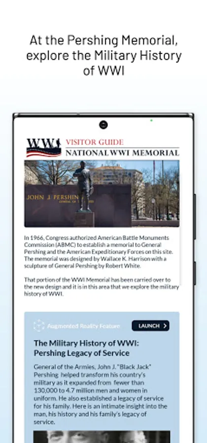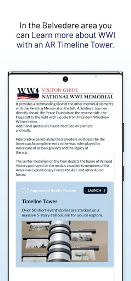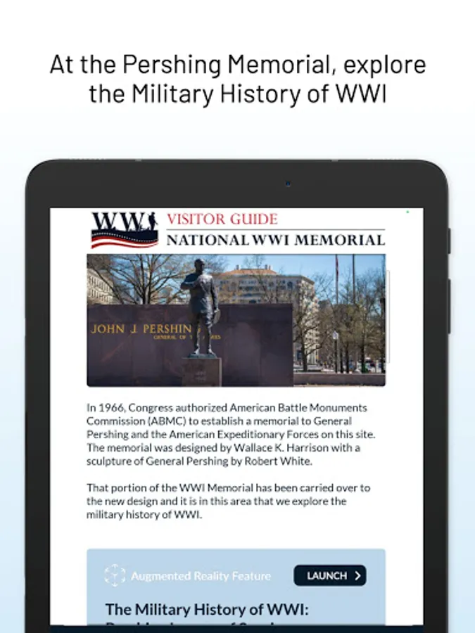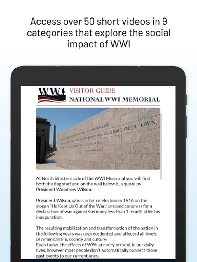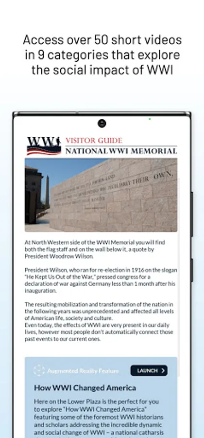 At the North Lower Terrace at President Wilson's quote, you can place an augmented reality viewer on the wall and select from over 50 short videos covering all the social aspects of WWI and how the War that Changed the World completely transformed every aspect of American life.