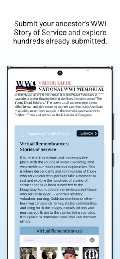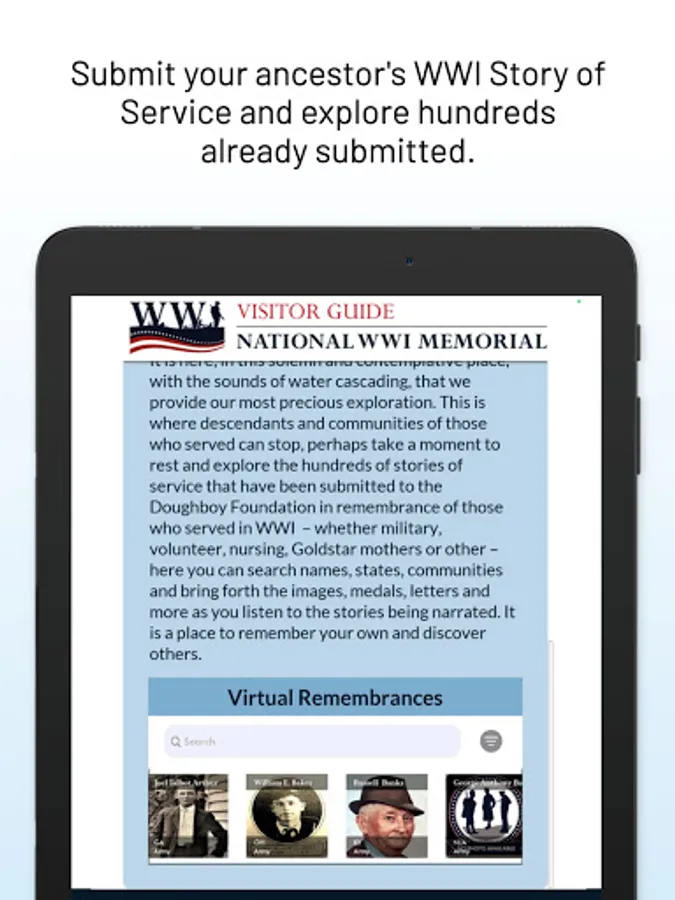 And finally, and perhaps most important, on the upper terrace by the Peace Fountain is where you can use the Visitor Guide App to explore the hundreds of Stories of Service that have been submitted to us by the public over the centennial period. Everyone is invited to contribute to this archive that lets you submit your ancestor's story of service in WWI, whether military or civilian. All these stories will be accessible in both the WWI Memorial Apps, the "Visitor Guide" for those at the Memorial in D.C. AND the "Virtual Explorer" that bring the entire memorial to everyone, anywhere whether at home or in the classroom.