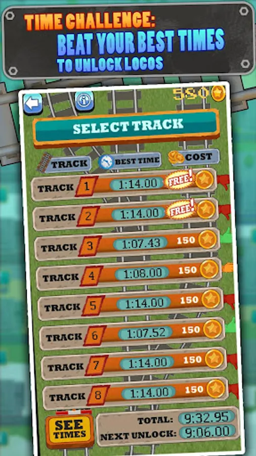 - Time Challenge: Replay each of the 8 tracks as fast as you can (swipe up+down to change your speed) to keep beating your best times. You need to lower the Total Time of all 8 tracks to upgrade your locomotive.