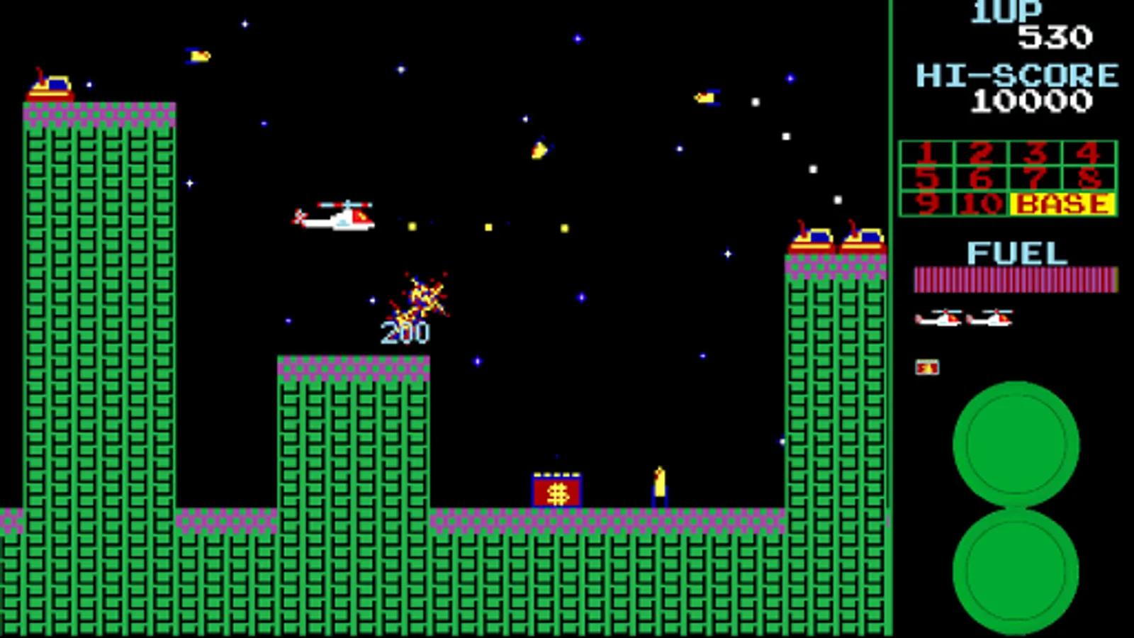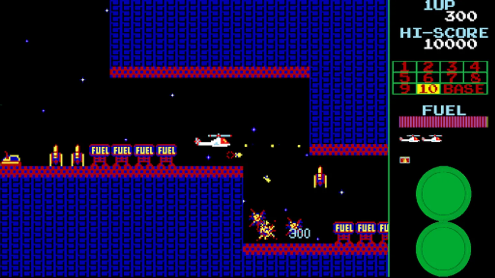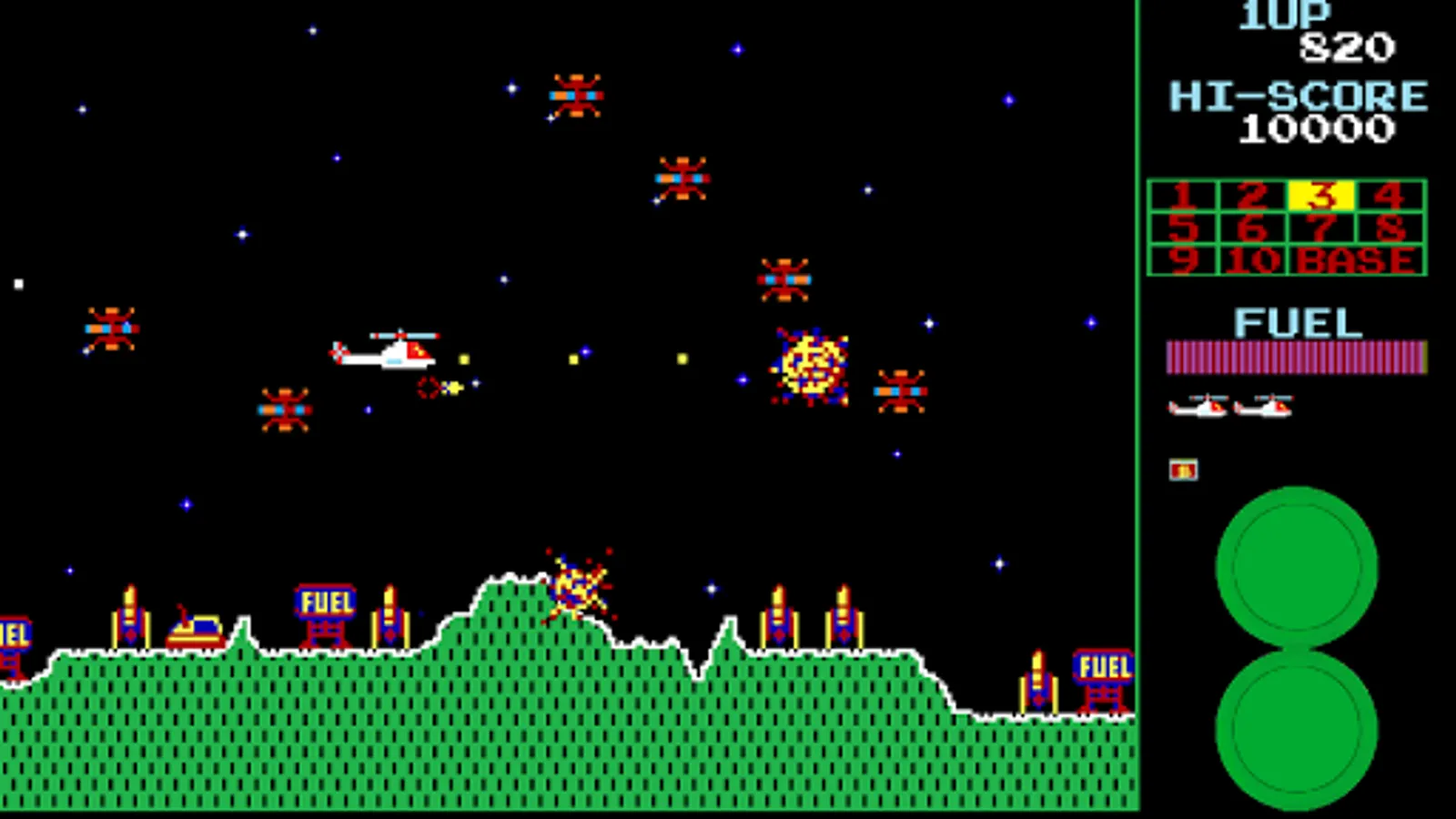 In this side-scrolling shooter arcade game, you navigate your helicopter through 11 stages, fighting rockets, tanks, UFOs and even a chasing meteor! One of the best 80s arcade games.