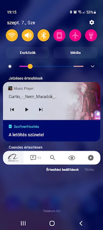 Primary notification with user interface, play, next and previous options.