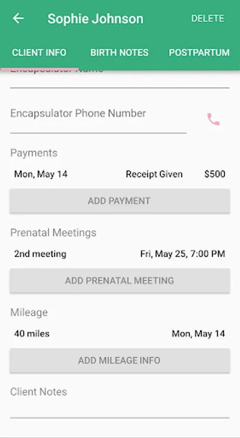It was created to allow birth doulas to easily and quickly make notes about a birth, store their clients' information, track mileage, and record the dates of meetings and payments. Information can also be sent to your email or cloud storage. All meetings can be synced to your phone's calendar to better integrate with your life.