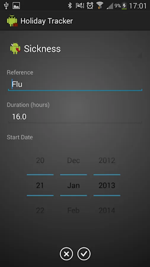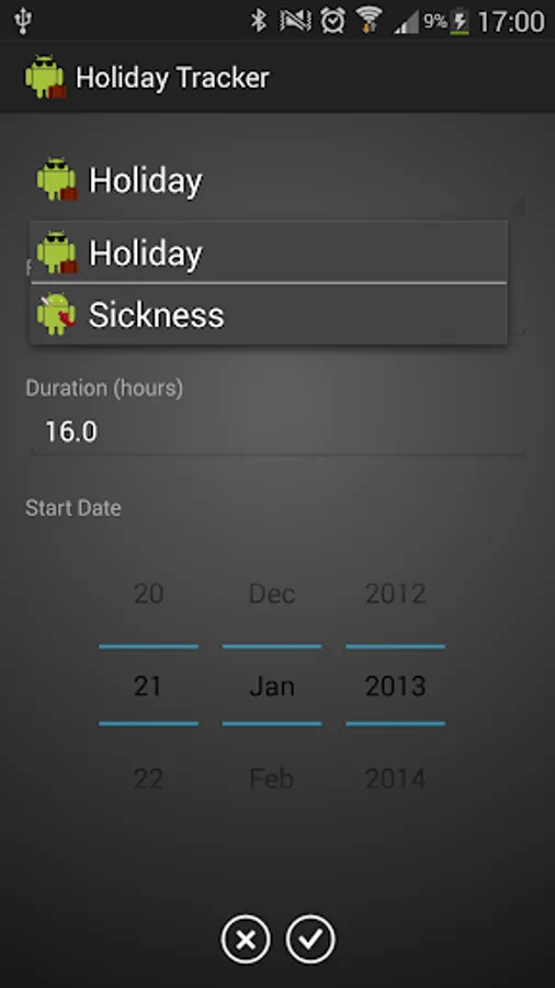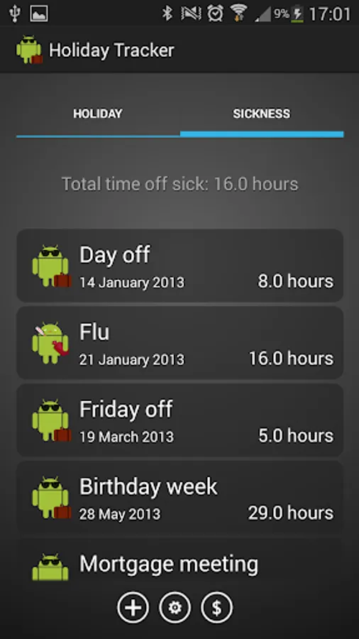 Keep track of your available holiday hours, vacation hours, holiday days, vacation days, sickness hours, sickness days, annual leave hours, annual leave days.