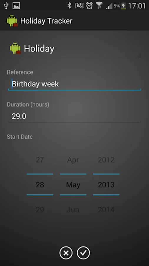 Set up Work Time Off Log with how much time off your are entitled to (measured in either days or hours), then log all the time off you have taken, or are going to take, by adding holiday/vacation bookings. Work Time Off Log will always clearly indicate how much time off you still have available.