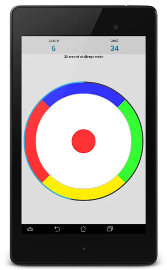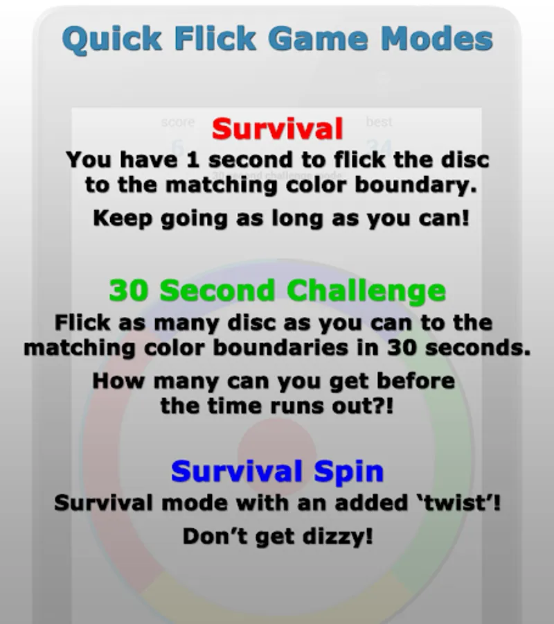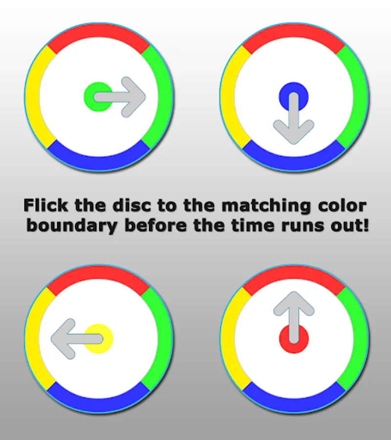 • Survival - You have 1 second to flick each disc to the matching coloured edge, keep going for as long as you can.