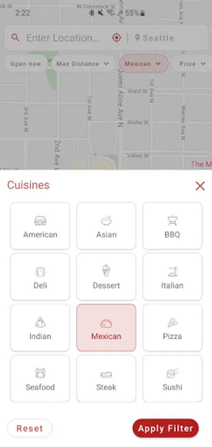 -Filter by cuisine ex. Mexican, American, Pizza, etc