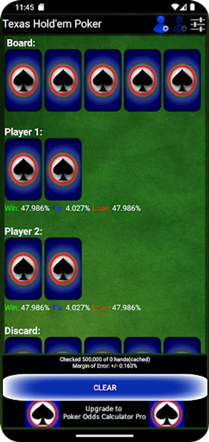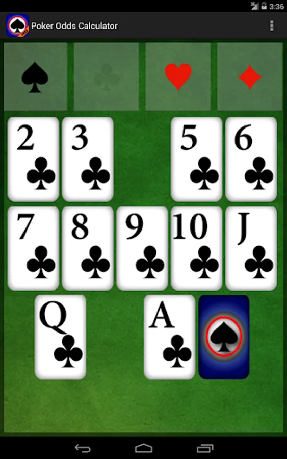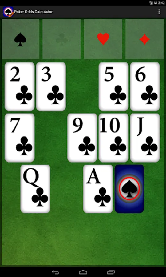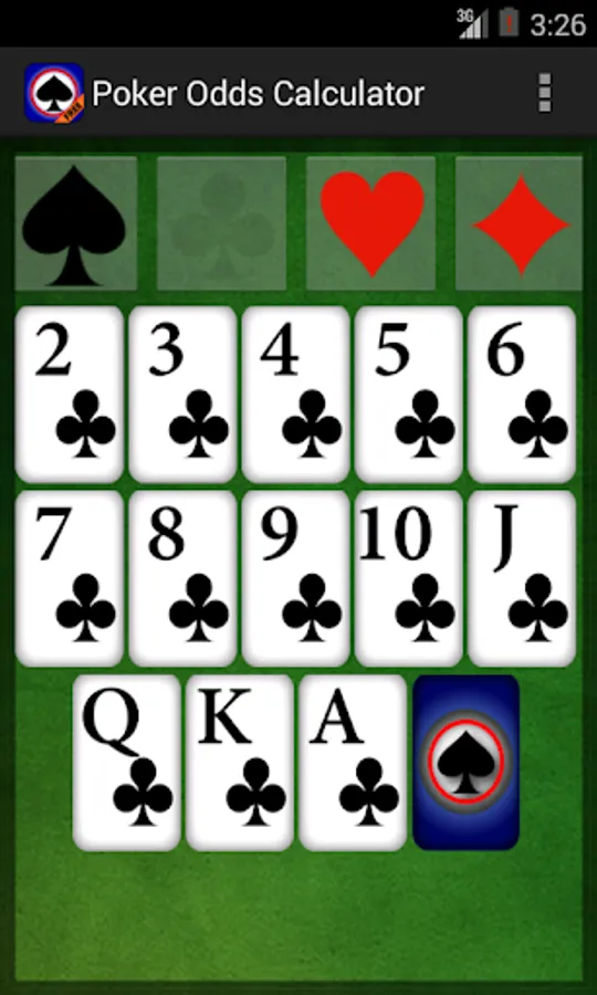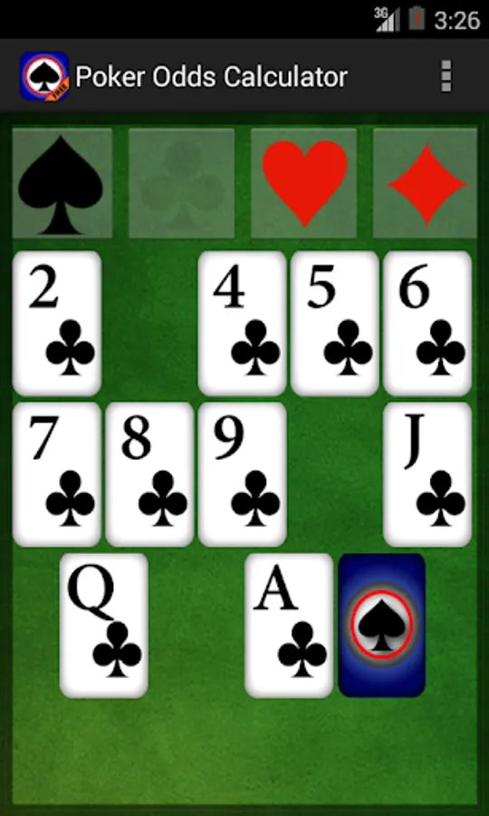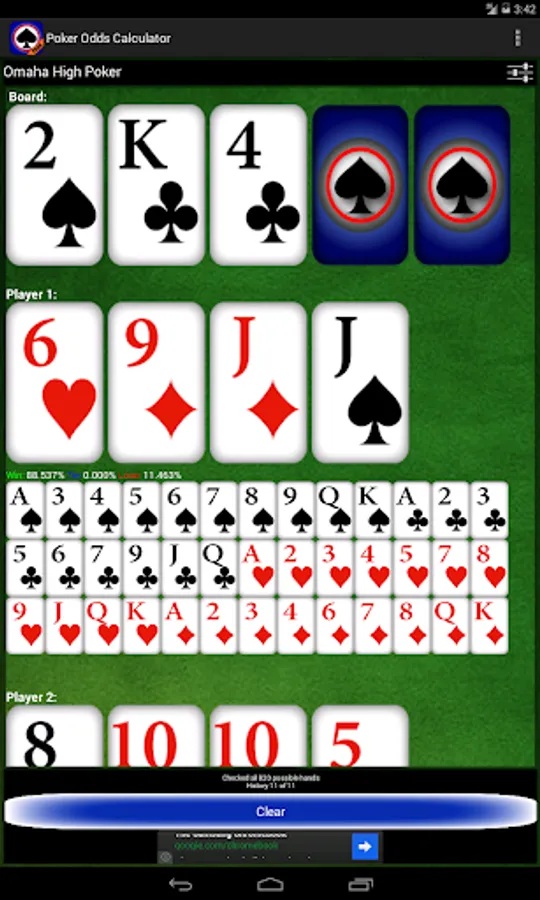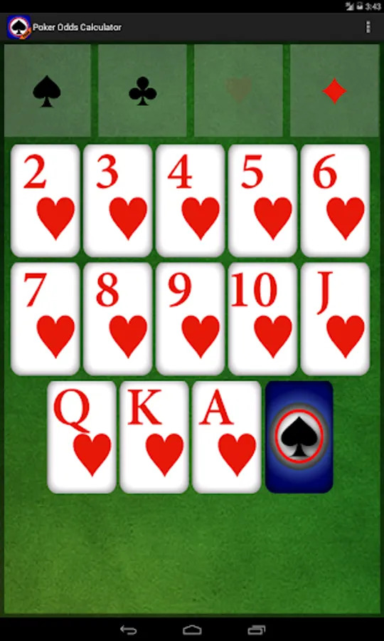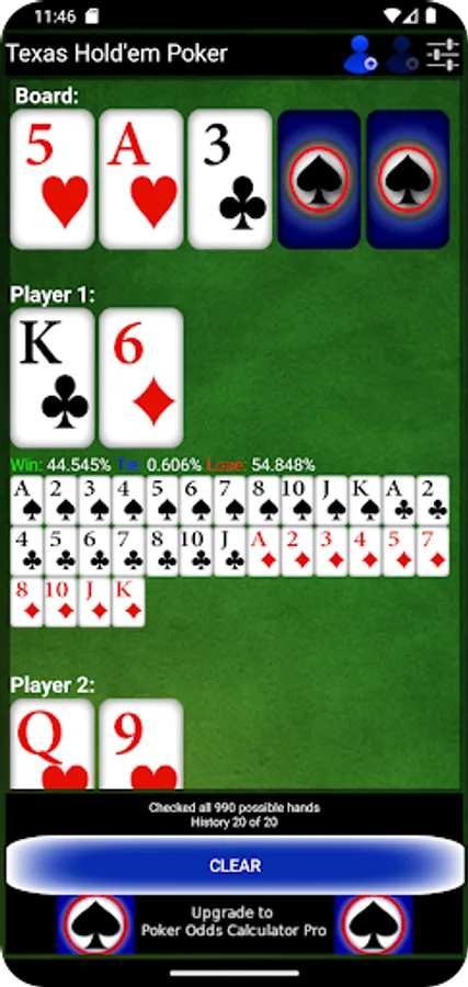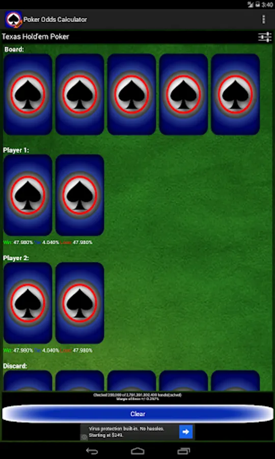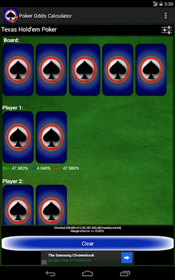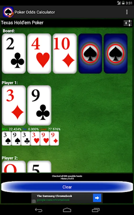 * Input any combination of player cards and board/community cards to calculate the odds of winning, tying, and losing