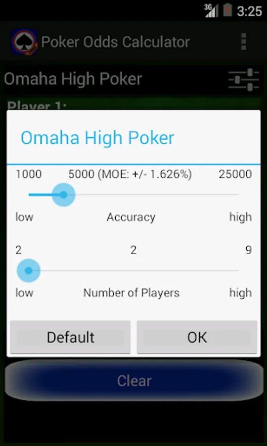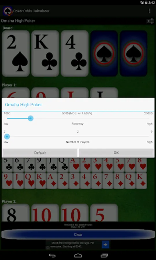 Odds/probabilities will be generated by either a simulation (approximation) or full calculation (exact odds) for up to 9 players, depending on the number of "unknowns" and the current accuracy setting. You can adjust the accuracy by pressing "settings" button in the top right corner.