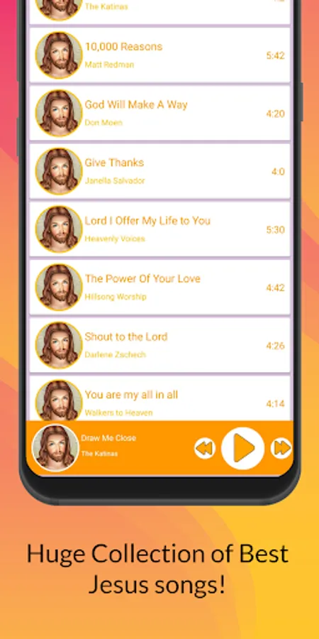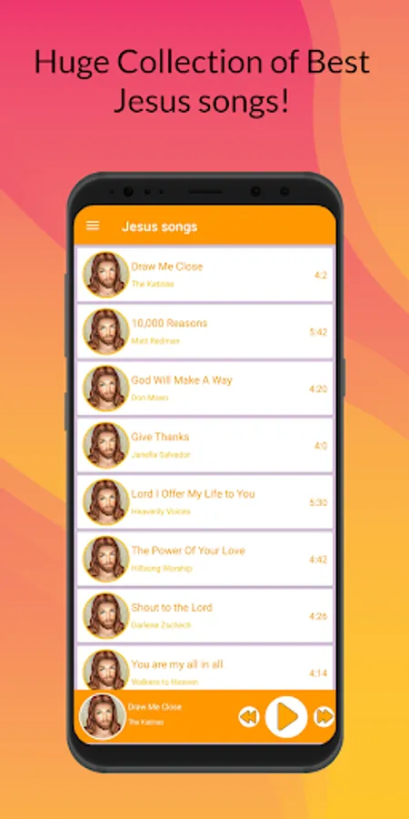 Jesus songs app contains the best offline Jesus songs. The purpose to prepare this app is to reach all Christians through Jesus songs. Jesus songs application designed for millions of Christians who are living across the world. Listening to these songs, God will always be with you.