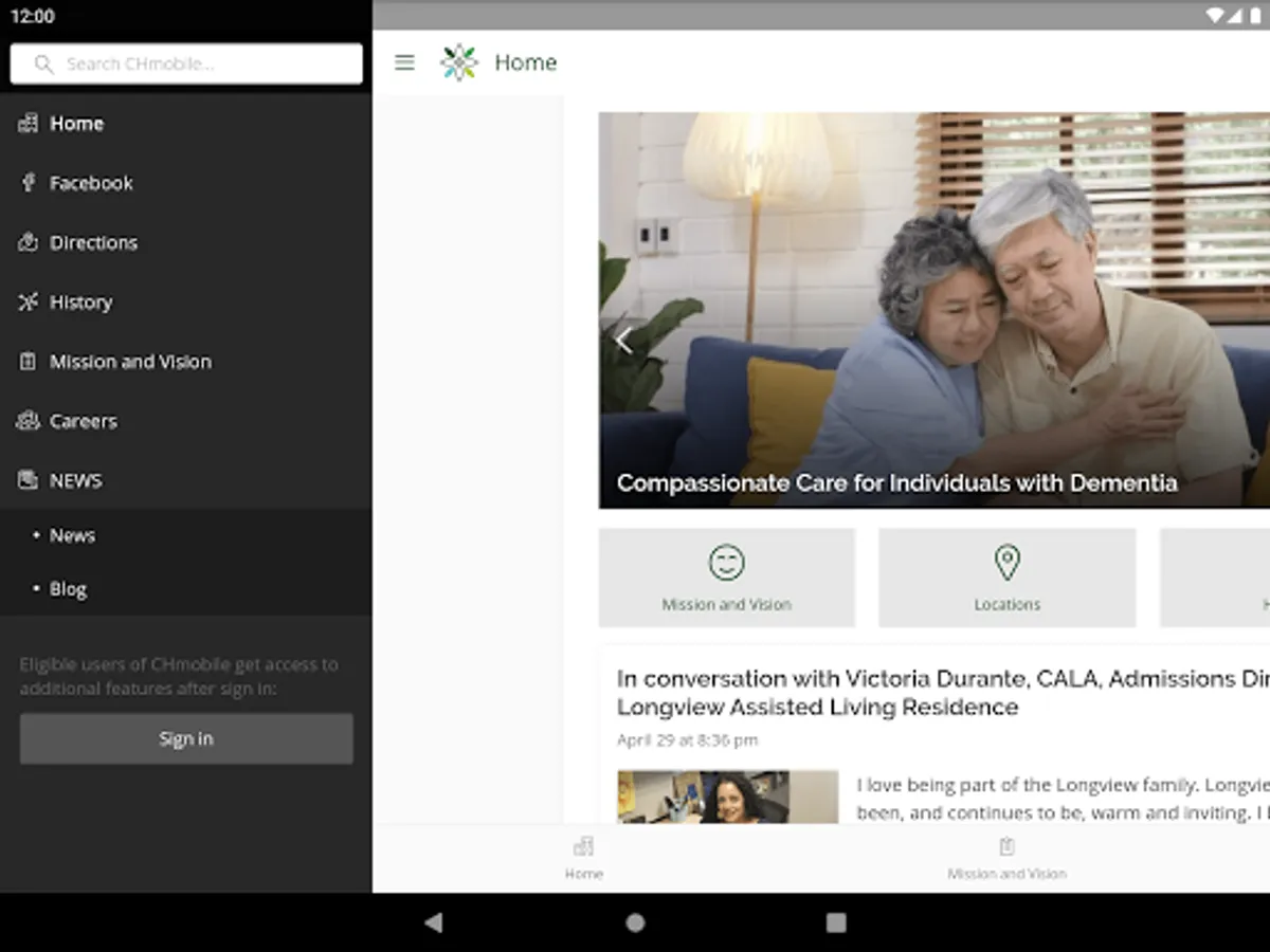 Christian Health Mobile is the communication app of Christian Health, a nonprofit organization providing senior living, short-term rehab, and mental health services in New Jersey. CHmobile provides current company information, news, and updates. Stay in the know about Christian Health. CHmobile keeps you informed about current news, latest projects, upcoming events, and much more in a way that is mobile, fast, and up-to-date.