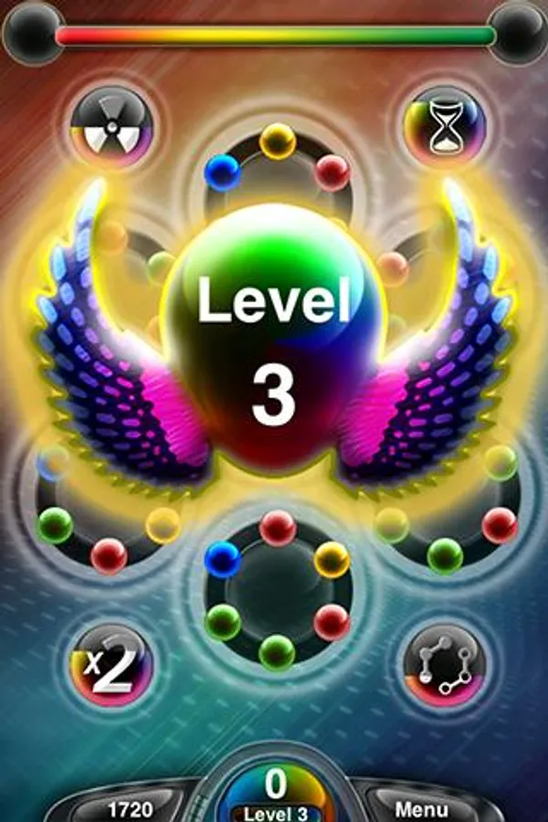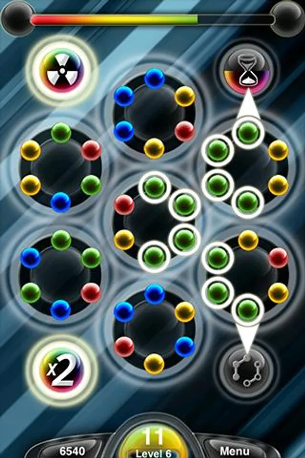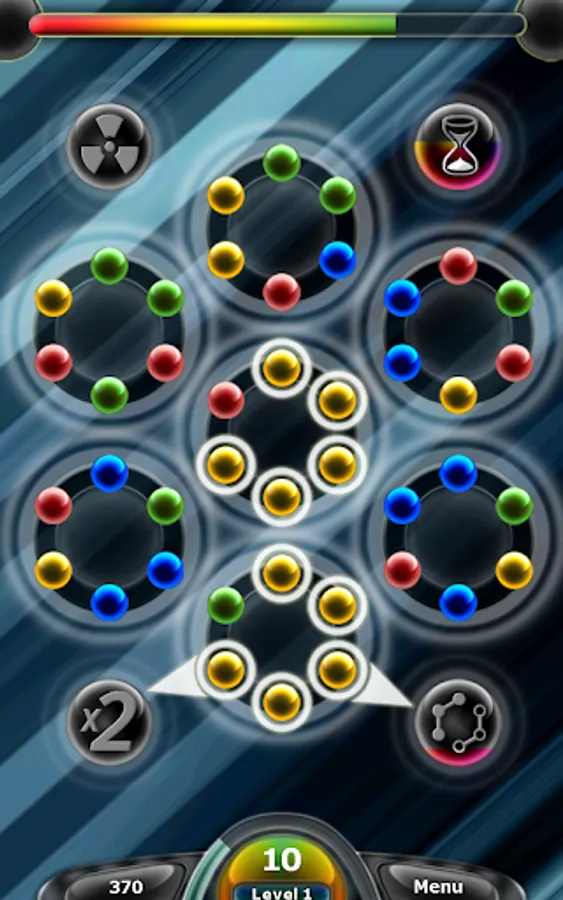 Spinballs is an exciting puzzle game with brilliant graphics, rocking music and great sound effects that introduces an unique gameplay. Seven discs with six coloured balls on each of them make up the playground. Each disc can be rotated clockwise or counterclockwise. Try to connect balls of the same colors by rotating those discs but never forget that time is running! The higher the levels the less time you have. Four helping elements can be charged and triggered to clear the field, slow down time, sort all balls or multiply the points owned. Use them wisely and develop your own strategy to reach the higher levels!