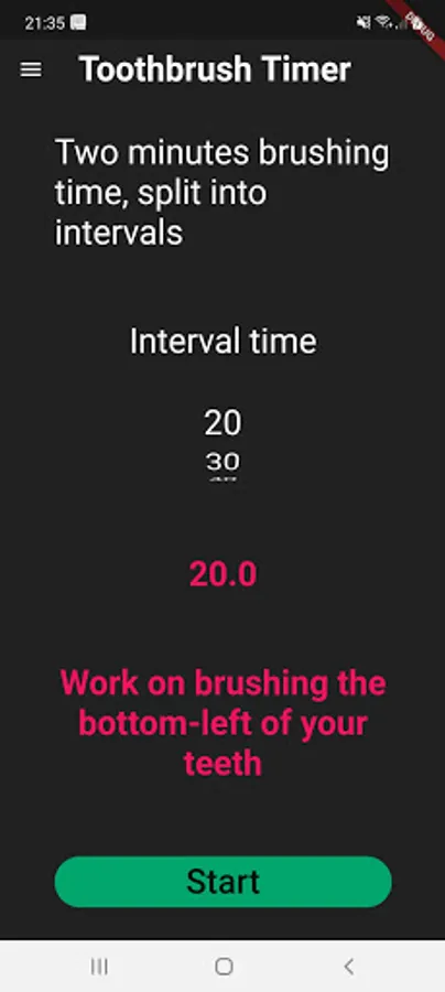 Dentist recommend that we brush our teeth for two minutes, twice a day. This app times two minutes, split into intervals that you can choose. During each interval the app suggests which area of your teeth you should be brushing.