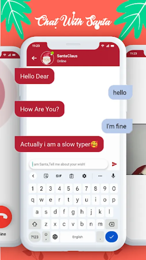 Santa Claus chat mode that allows and helps you to send and receive messages from Santa Claus. Make your coming Christmas more special and get audio, video call and chat from Santa Claus. Santa call simulation app having fake video identity, chat bot and Merry Christmas app. Let them speak to Santa Claus in this prank identity Santa calling app.
