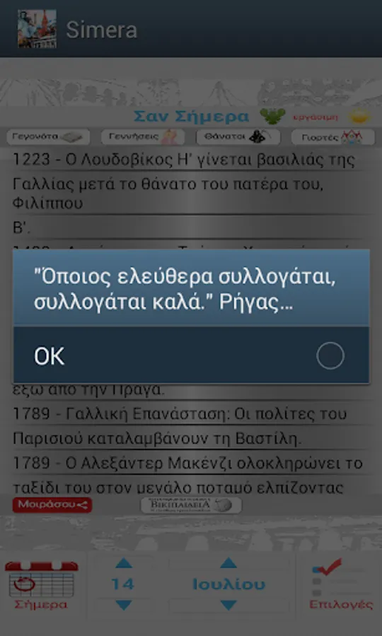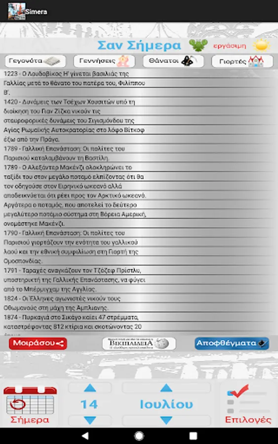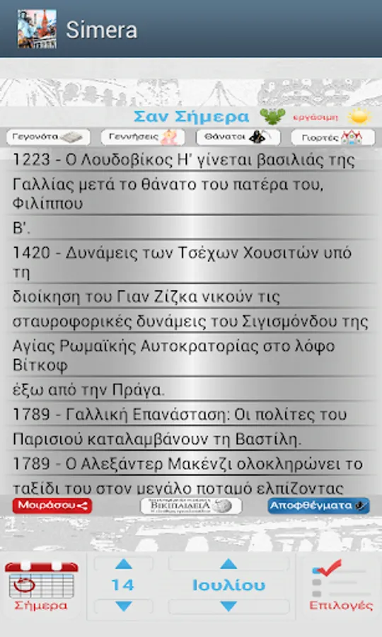 - Possibility of sharing on social networks or via sms, email events "like today"