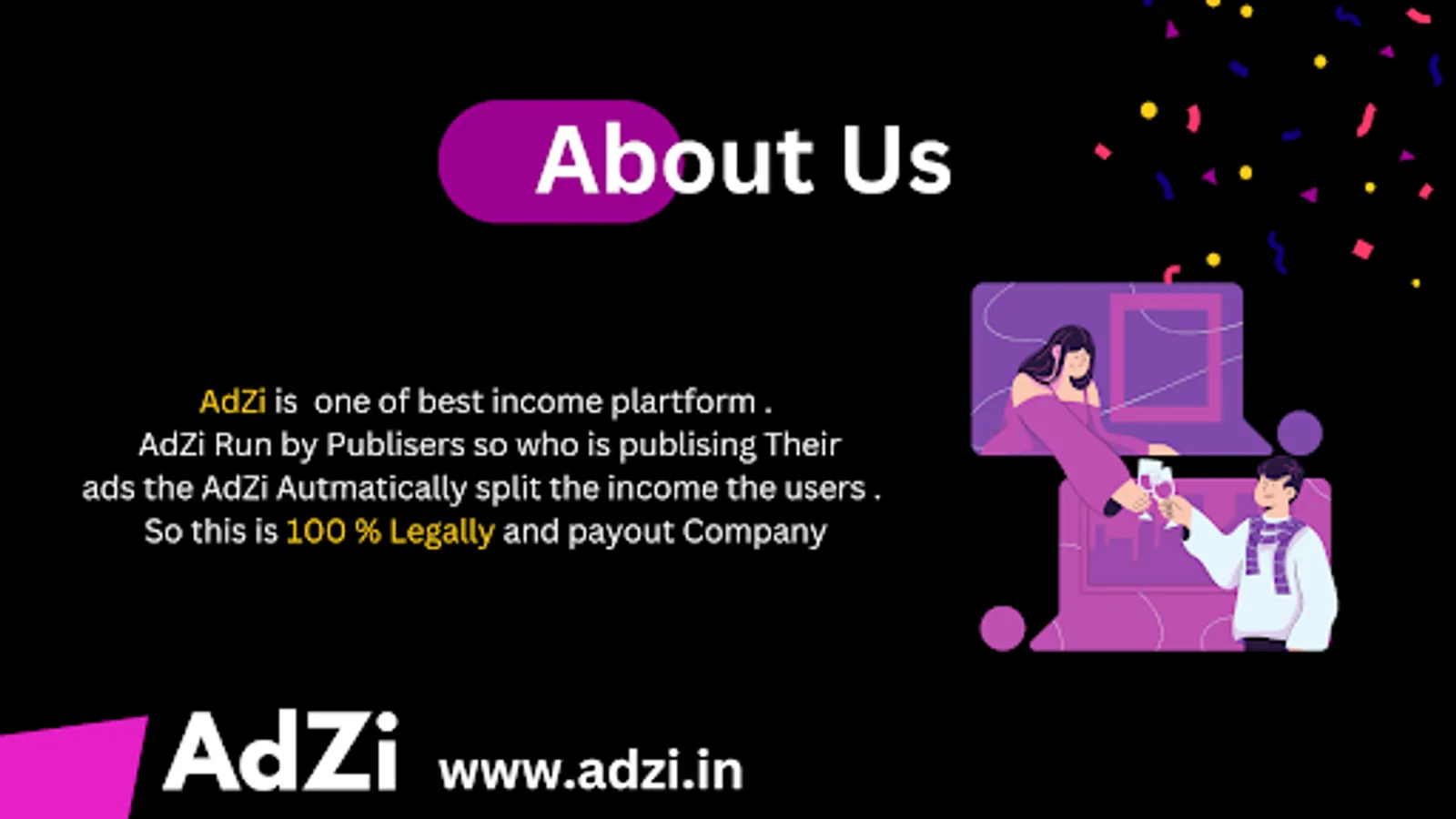 Welcome to AdZi is Money Earning app . This work based on Advertising . Adzi gives to some daily tasks if you complete that you will get on result.