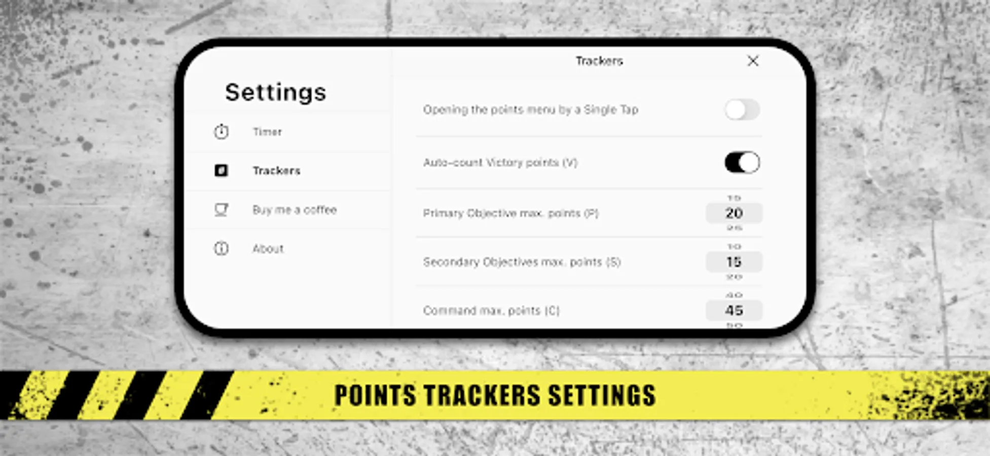 The app has different setting options for the timer and points trackers functions.