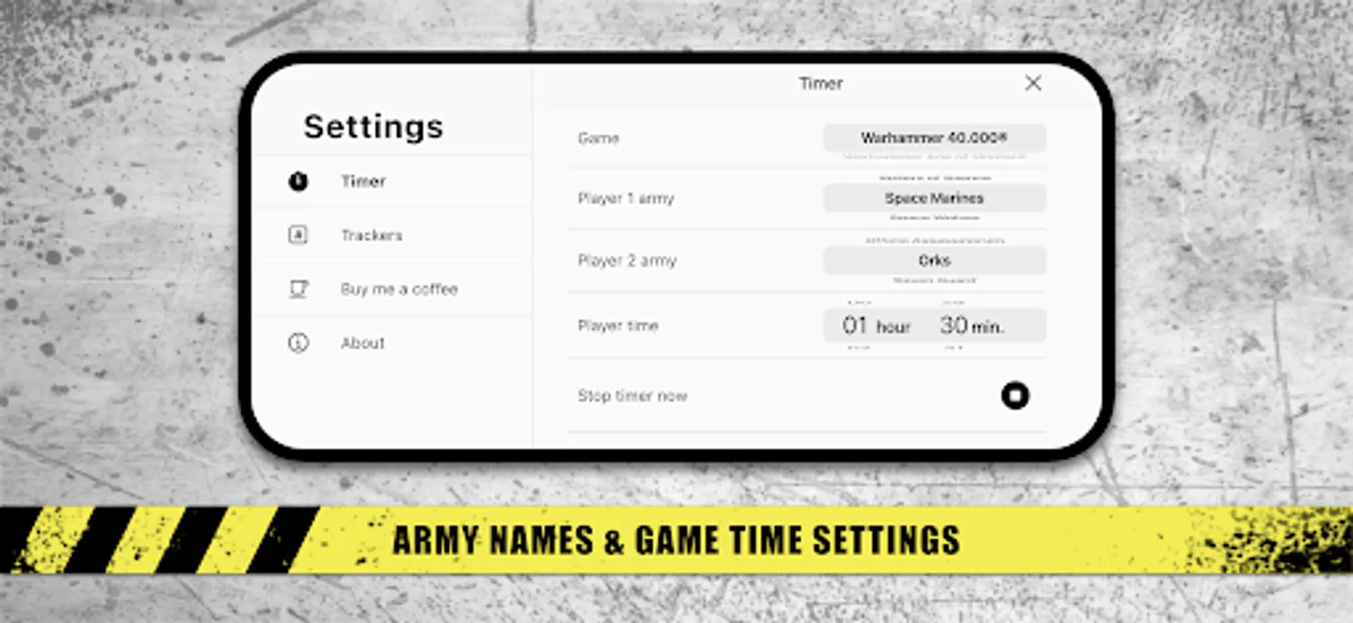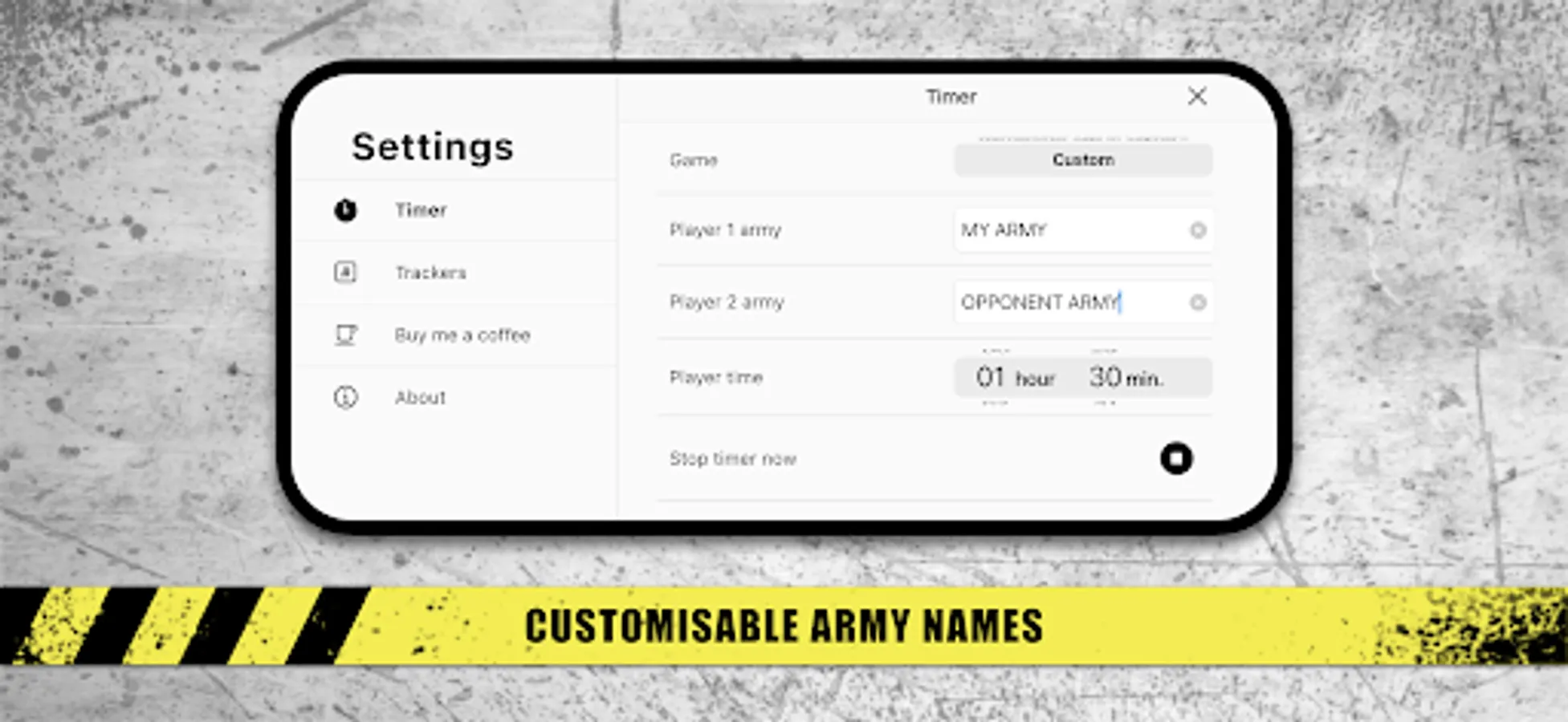 The timer buttons can be customized with the army name of each player, which can be filled in manually or chosen from the army lists available for the 2 most common wargames*.