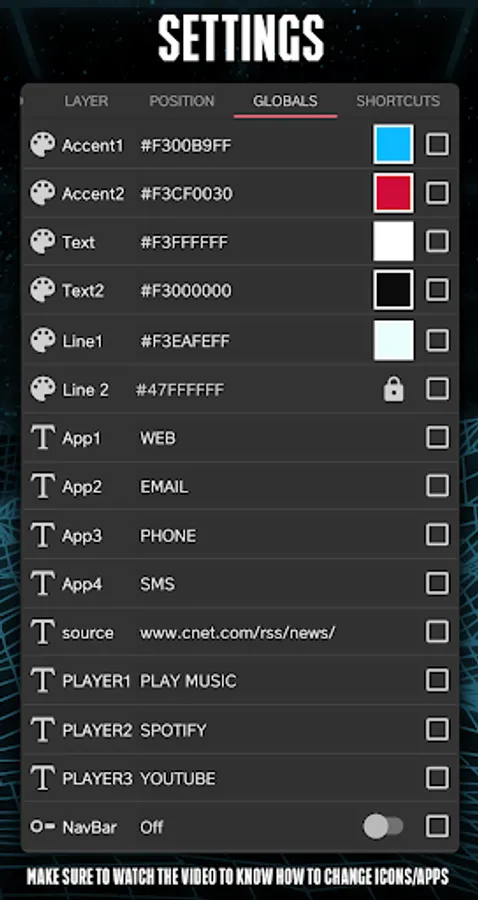 There are 3 Player options in the music section originally connected to Spotify, Google Play Music and YouTube and you can change the text of these 3 buttons in the Globals section