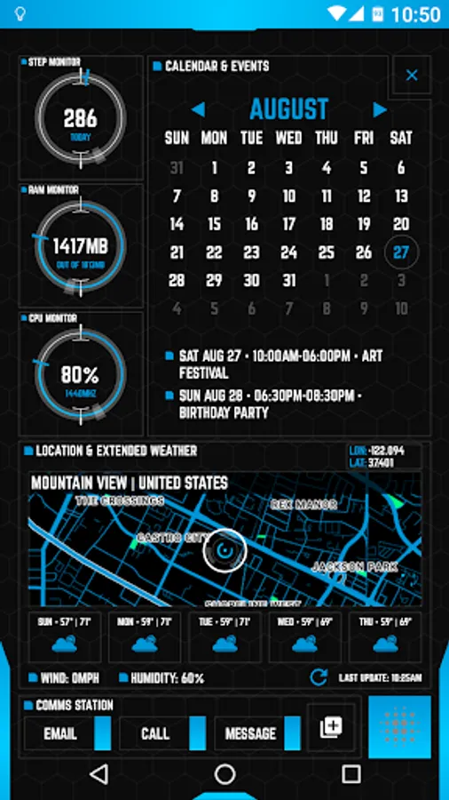 Note: Depending on your screen size you may need to scale the theme by opening KLWP - in the root layer go to "LAYER" - scale it using the - and +, do not use the double arrows. And also depending on the screen size and scaling things may look a bit different than the screenshots.
