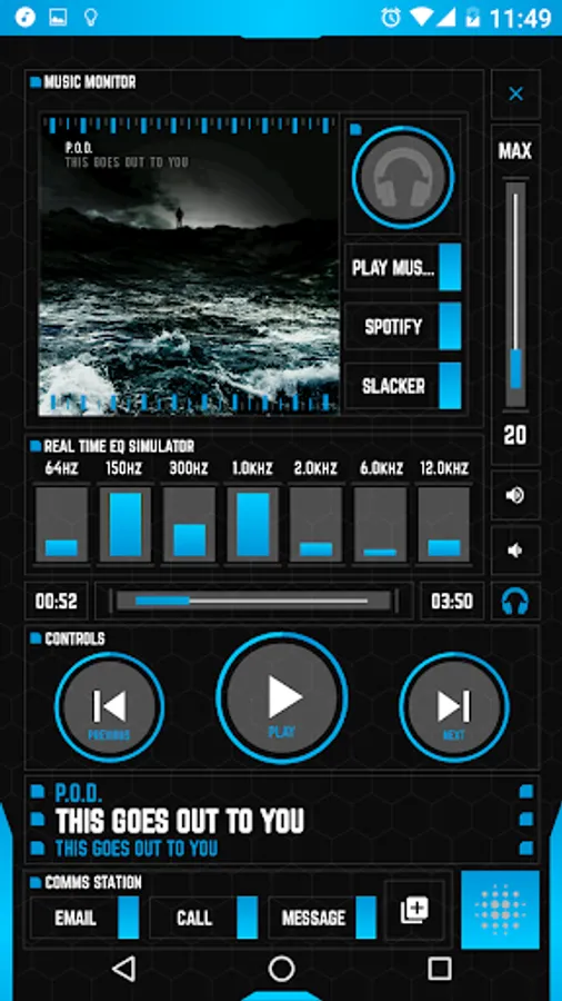 There are 3 Player options in the music section originally connected to Spotify, Google Play Music and Slacker, you can change the text of this 3 buttons in the Globals section and the app in the shortcuts section.