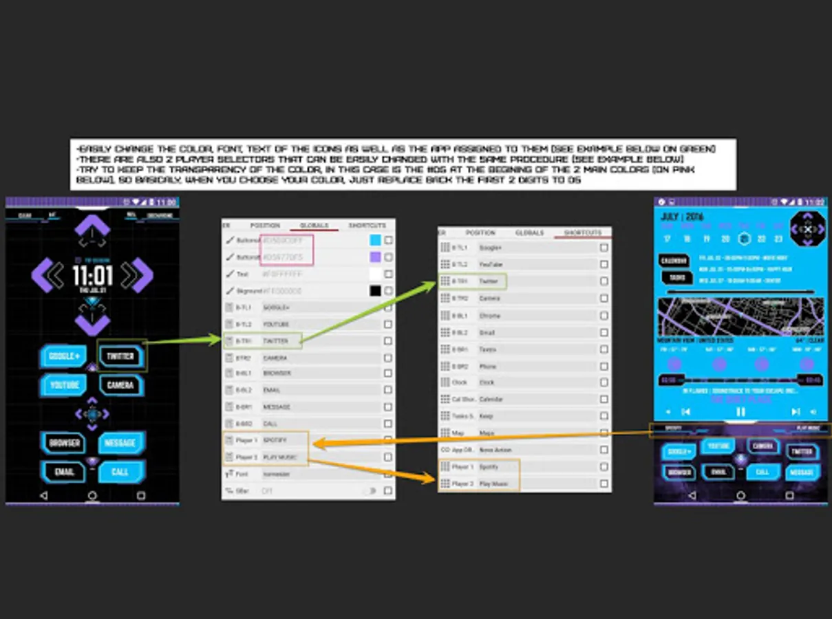 There are 2 Player options in the music section originally connected to Spotify and Google Play Music, you can change the text of this 2 buttons in the Globals section and the app in the shortcuts section.