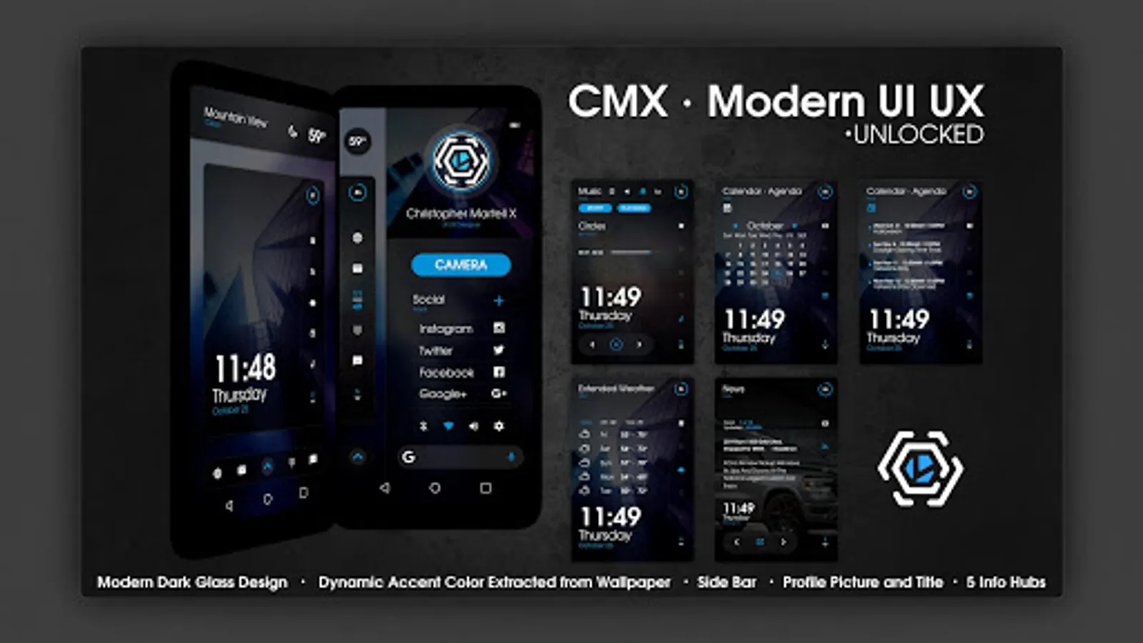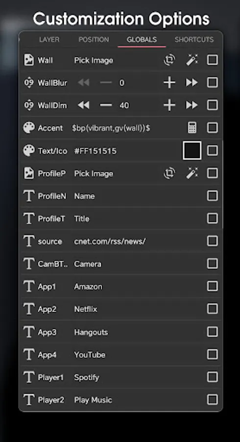 There are 2 hidden Player options in the music section originally connected to Spotify and Google Play Music you can change the text of this 2 buttons in the Globals section and the app in the shortcuts section as well as the 4 hidden App shortcuts on the bottom.