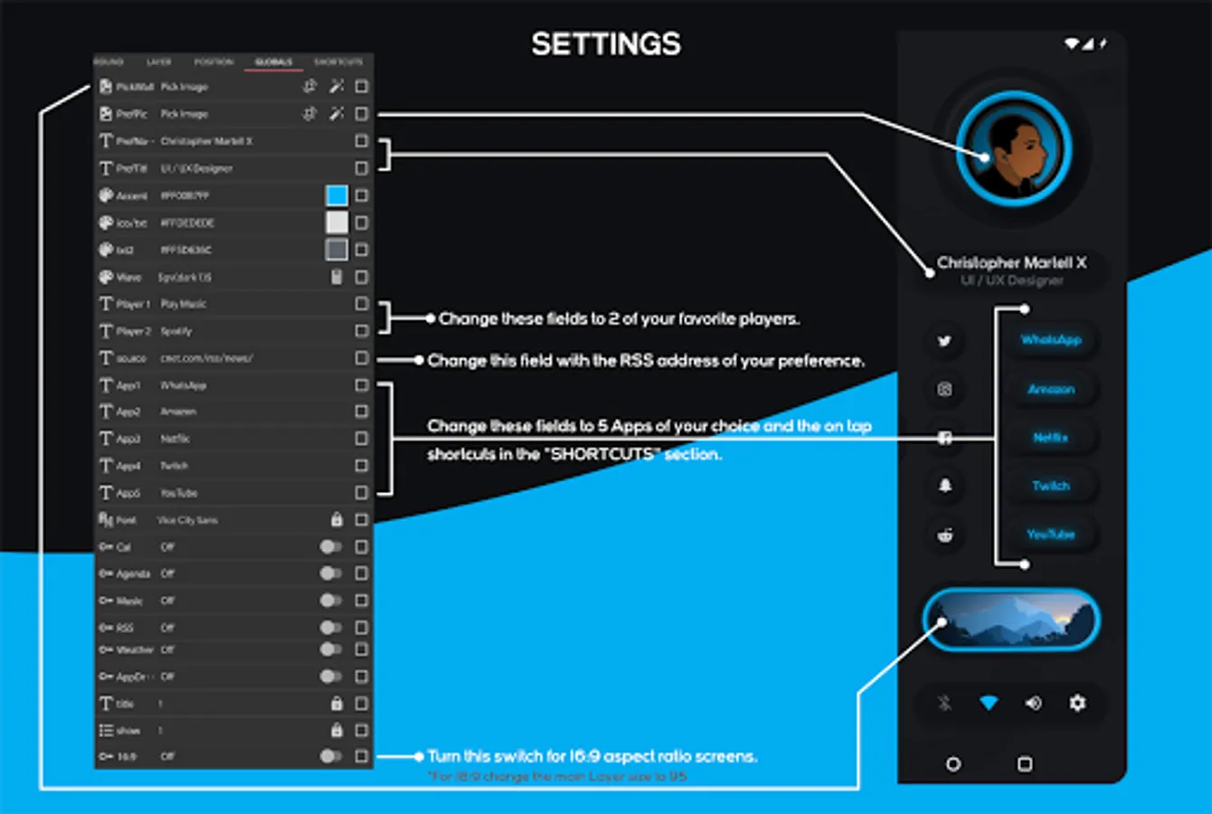 Compatible with 18/9 (Change Main Layer Size to 95) and 16/9 (Switch in GLOBALS) Aspect ratio screens