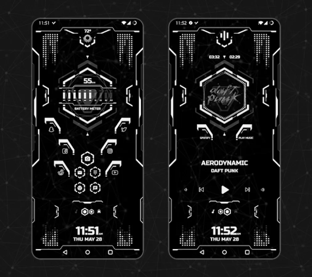 Note: Depending on your screen size you may need to scale the theme by opening KLWP - in the root layer go to "LAYER" - scale it using the - and +, do not use the double arrows. And also depending on the screen size and scaling things may look a bit different than the screenshots.