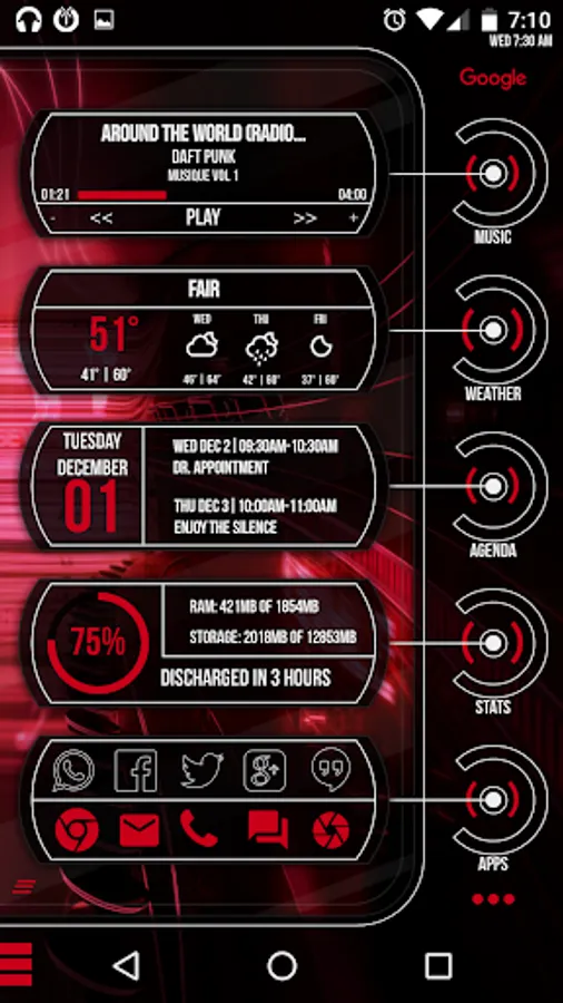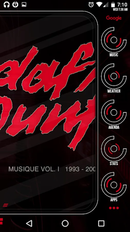 Note: Depending on your screen size you may need to scale the theme by opening KLWP - in the root layer go to "LAYER" - scale it using the - and +, do not use the double arrows. And also depending on the screen size and scaling things may look a bit different than the screenshots.
