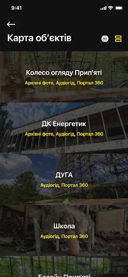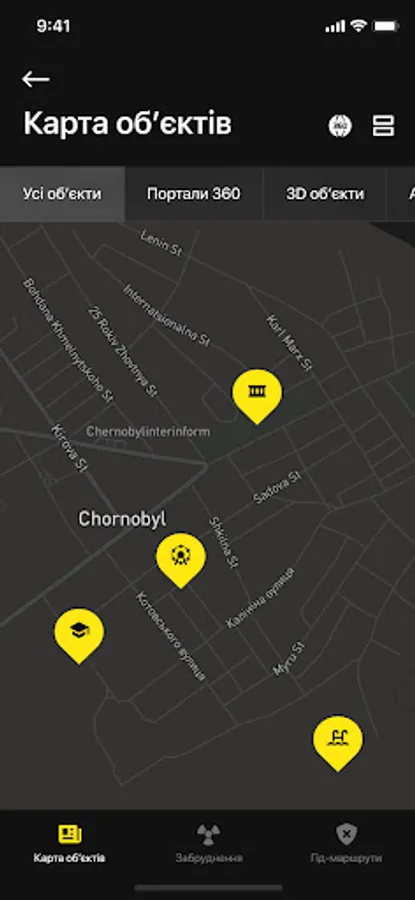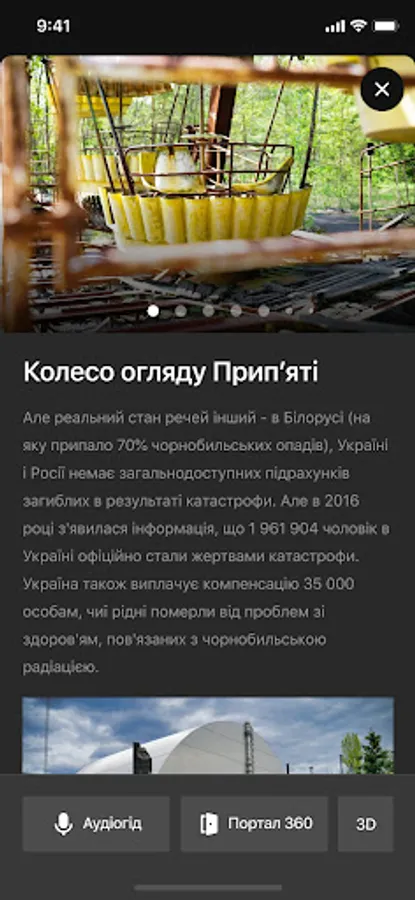 The first Chornobyl official mobile application with AR created to the 35th anniversary of the accident. The mobile application will acquaint users with the history of the Chornobyl accident, provide information about the current status of the Exclusion Zone, will help you to prepare for a trip and even allow you to see Chornobyl from the couch.