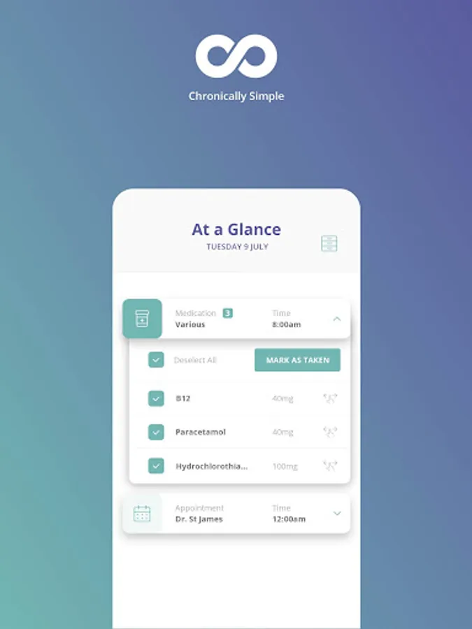 Chronically Simple makes dealing with a chronic illness less overwhelming. It stores all of the must-have information and daily tasks in one place. It’s accessible wherever you are and can be updated from anywhere.