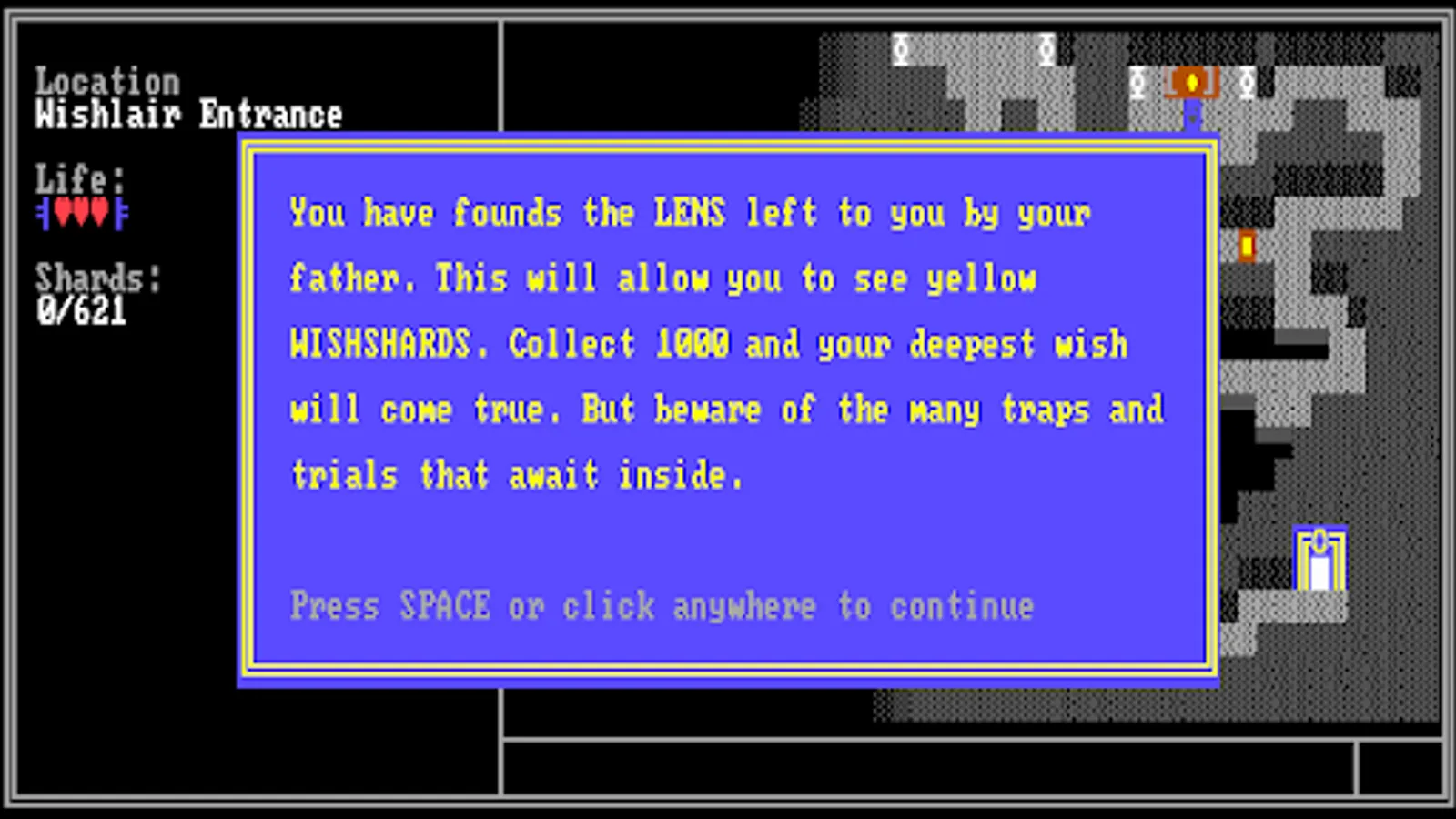 A year ago, your father left in search of the mythical realm of Wishlair. Then one fateful night, you receive word that he has succeeded—and he summons you to join him there. Travel a vivid, nostalgic world rendered with the original IBM PC character set. Confront the dangers of the Old Kingdom and the Underrealm as you search for the elusive entrance to Wishlair. Discover weapons, items, and artifacts to help you on your quest. Vanquish the fearsome creatures that lurk in the shadows. Explore over a hundred rooms, learning the lore of the land, collecting the mystical Wish Shards, and slowly unlocking the secrets of Wishlair.