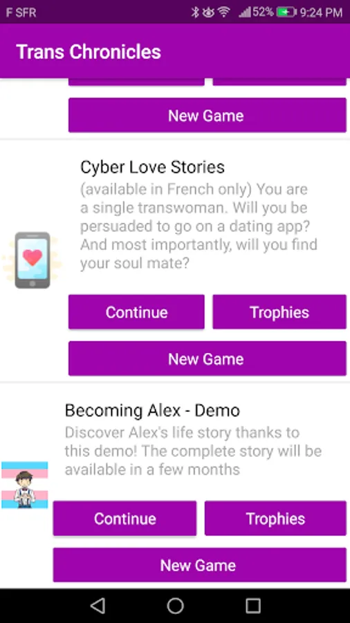 - Cyber Love Stories: (available in French only) You are a single transwoman. Will you be persuaded to go on a dating app? And most importantly, will you find your soul mate? (full story)