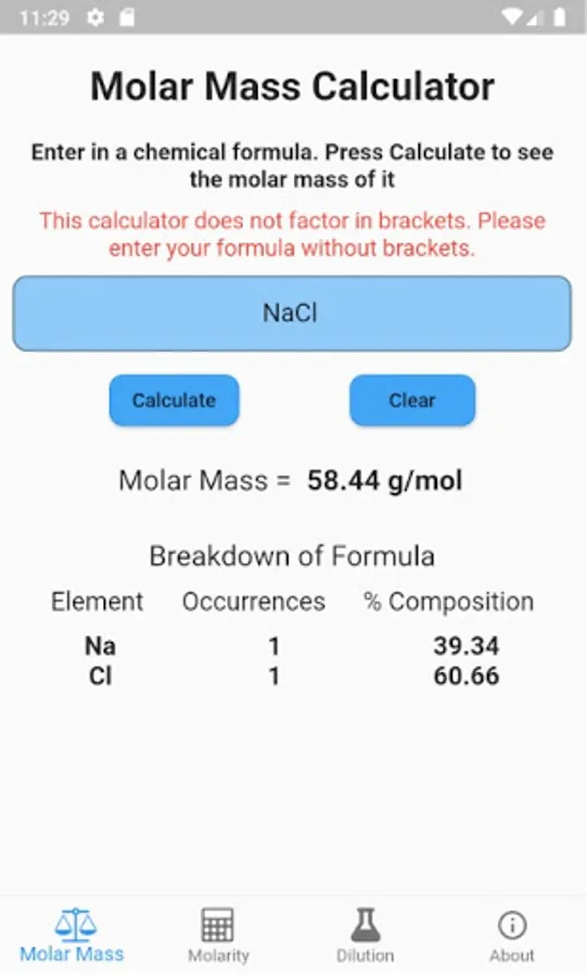 - In molar mass calculator, enter a chemical formula (without brackets) and press the ‘Calculate’ button. The app will calculate the molar mass and elemental breakdown of the given chemical formula.