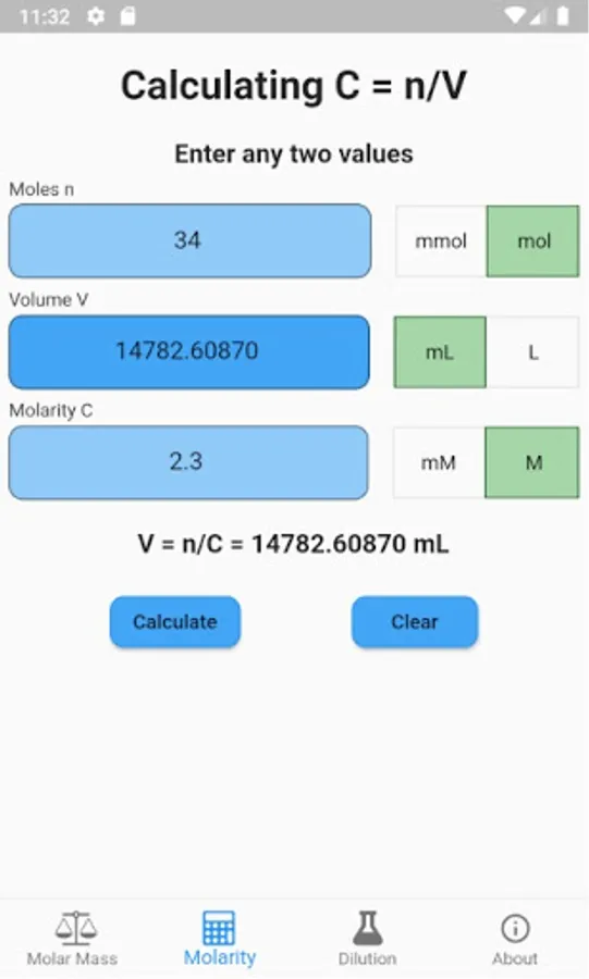 - For the molarity calculator, enter any two values along with the units and press ‘Calculate’ to determine the third unknown value.