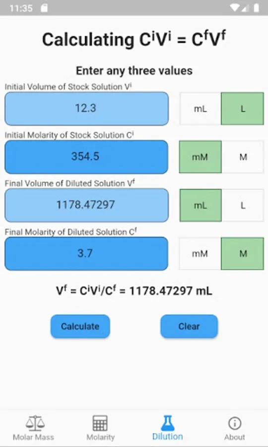 - For the molarity and dilution calculator, the formulas are rearranged with respect to the unknown value and displayed to the user.
