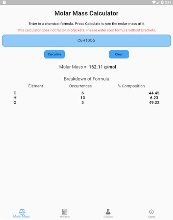 This chemistry calculator app contains three calculators: 1) molar mass calculator, 2) molarity calculator, and 3) dilution calculator. The molar mass calculator quickly determines the molar mass and elemental breakdown of a given chemical formula. The molarity calculator follows the general dilution formula C=n/V such that when given any two values, it will calculate the unknown value. The dilution calculator follows the formula CiVi=CfVf to determine an unknown value when given any three values. This app is designed for high school and university chemistry students to quickly calculate common but simple tasks.