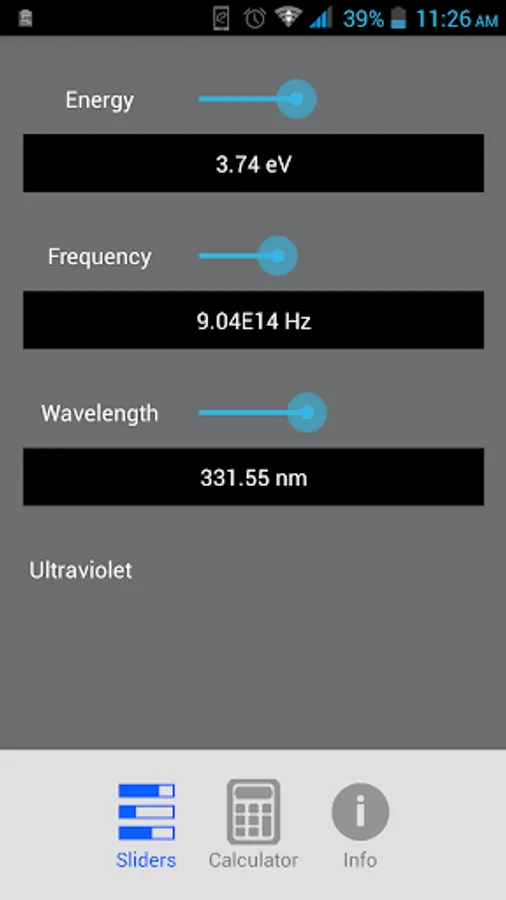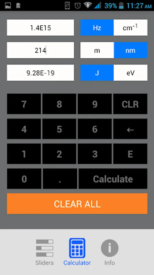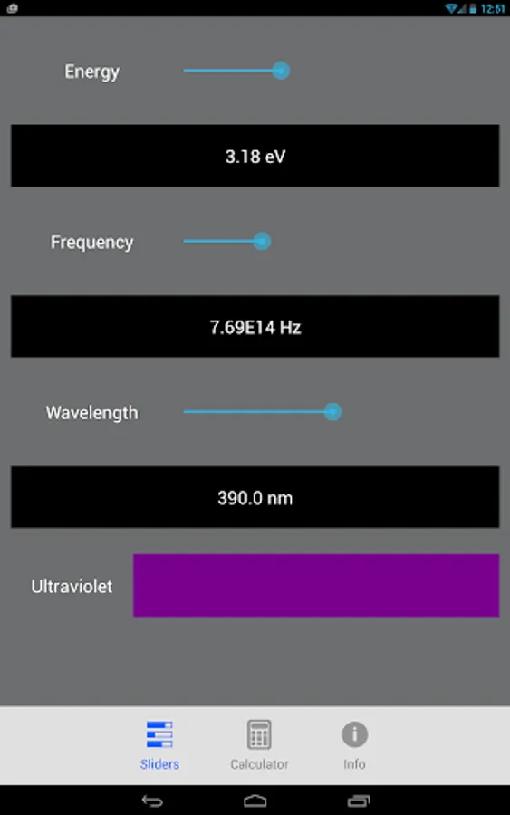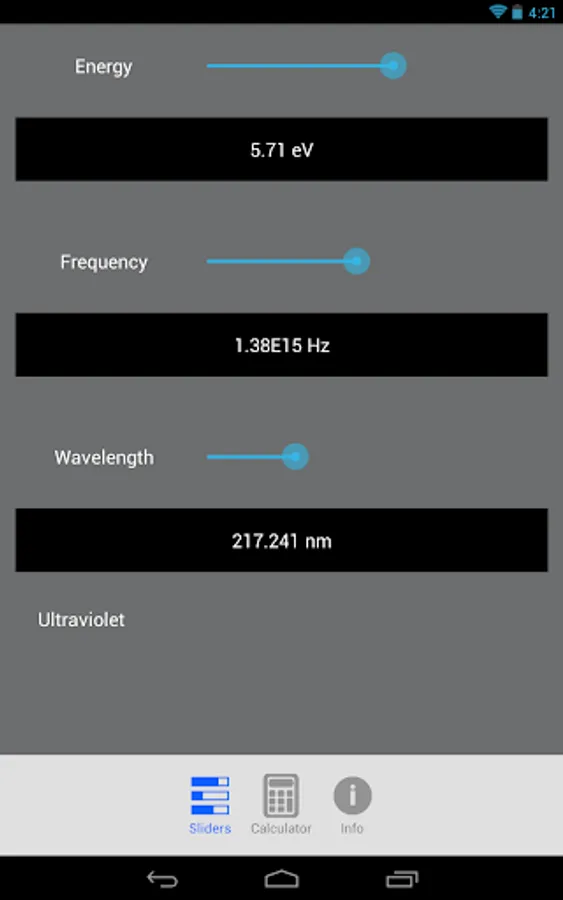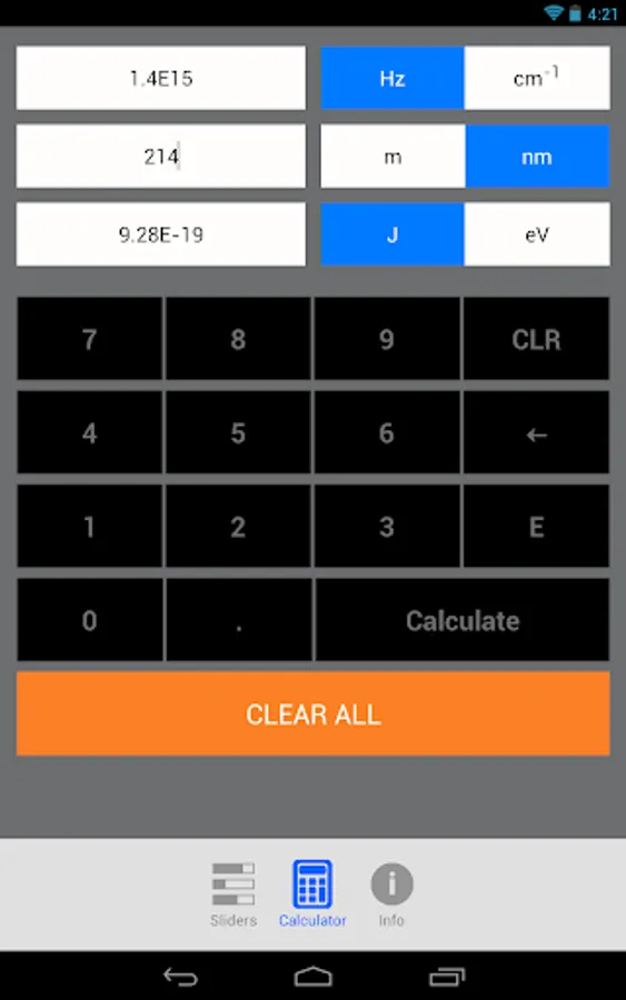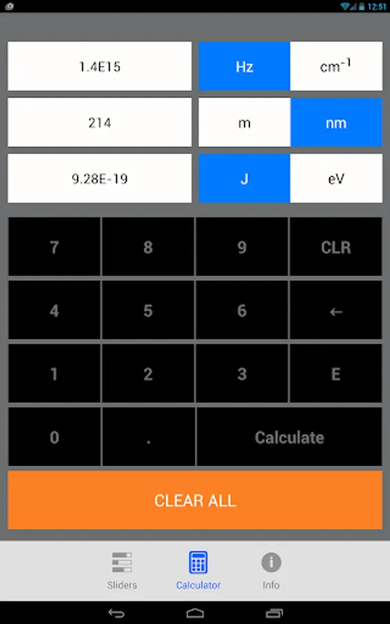 - Press ‘Calculator’ tab to calculate energy, wavelength or frequency, based on the user input.