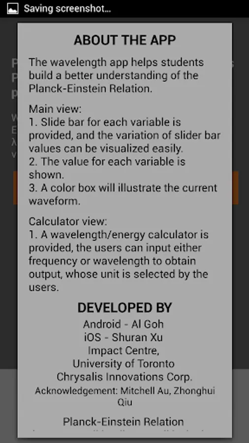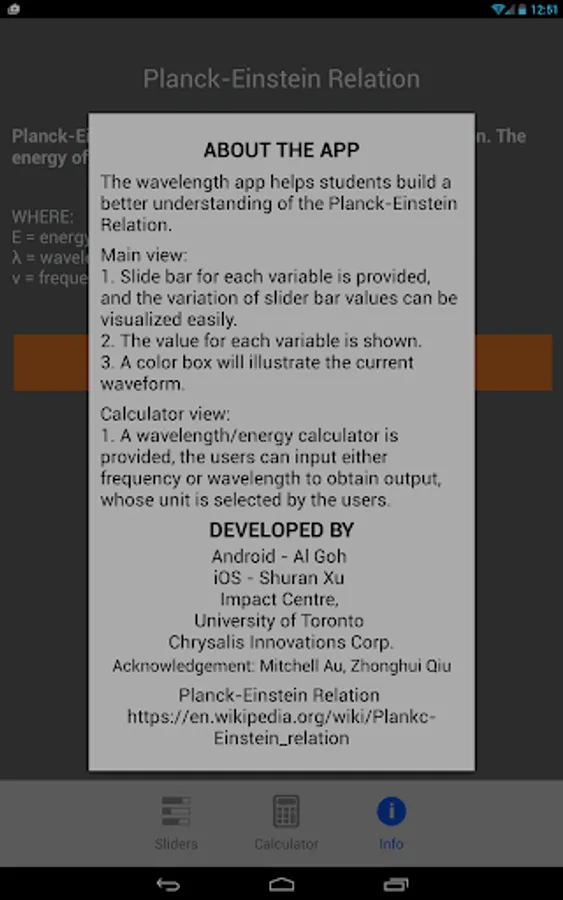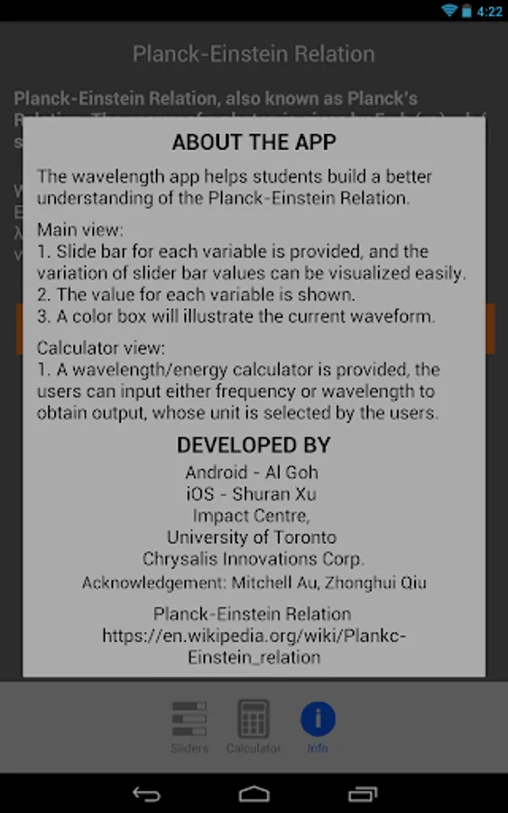 The Wavelength app is designed to help students learn Planck-Einstein Relation, especially for first-year science and engineering students and high school students. Specifically, this app provides multiple features to enable students to easily visualize the relation of each variable in Planck-Einstein Relation, and also provides a calculator function.
