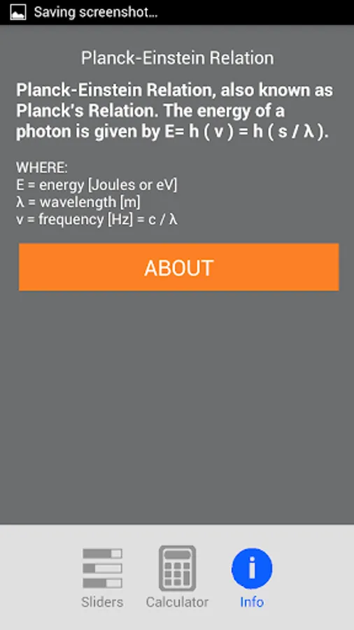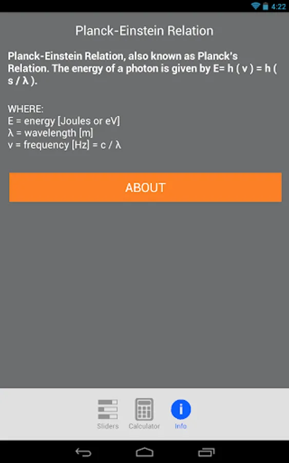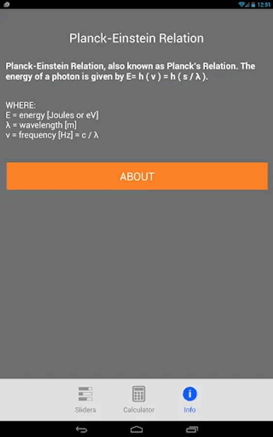 - Press ‘Info’ tab to get detailed information regarding Planck-Einstein Relation, and to use the Notes function.