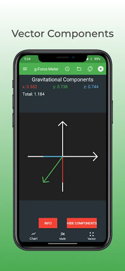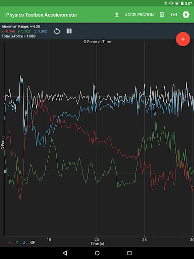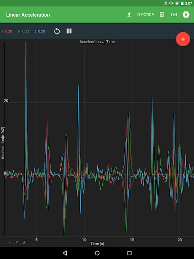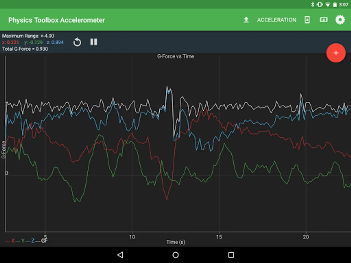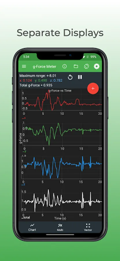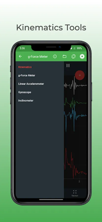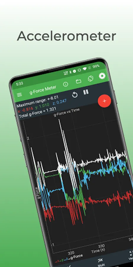 This accelerometer sensor app measures and displays multiple forms of kinematics (motion) data, including the g-Force Meter, Linear Accelerometer, Gyroscope, and Inclinometer. It displays relevant information in x, y, and/or z dimensions, as well as total magnitude in graphical, digital, and vector formats.