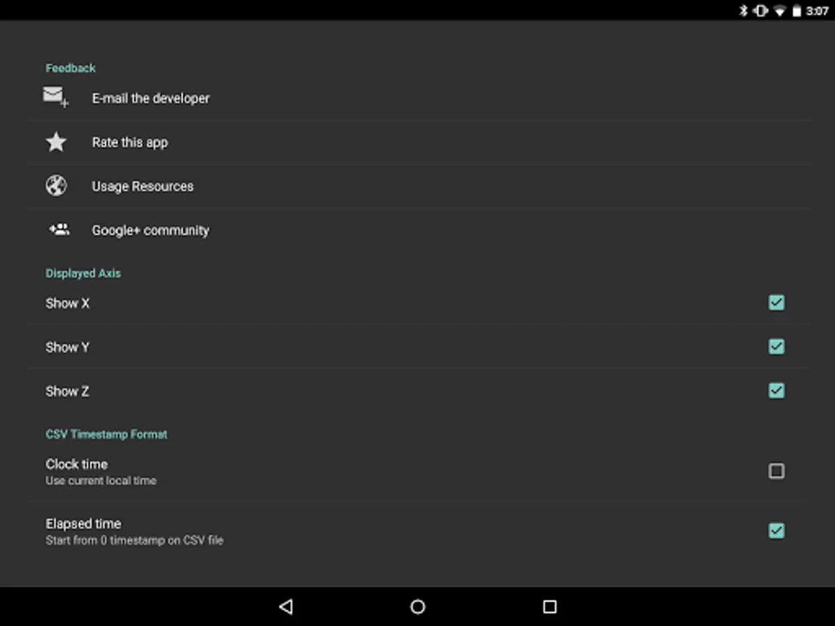 Users can export .csv data for further analysis in a spreadsheet or plotting tool. Click on settings to plot data against elapsed time or clock time, to change the plot line thickness, or to change data collection rate. A brief tutorial upon start-up gives an overview of how to use the app.