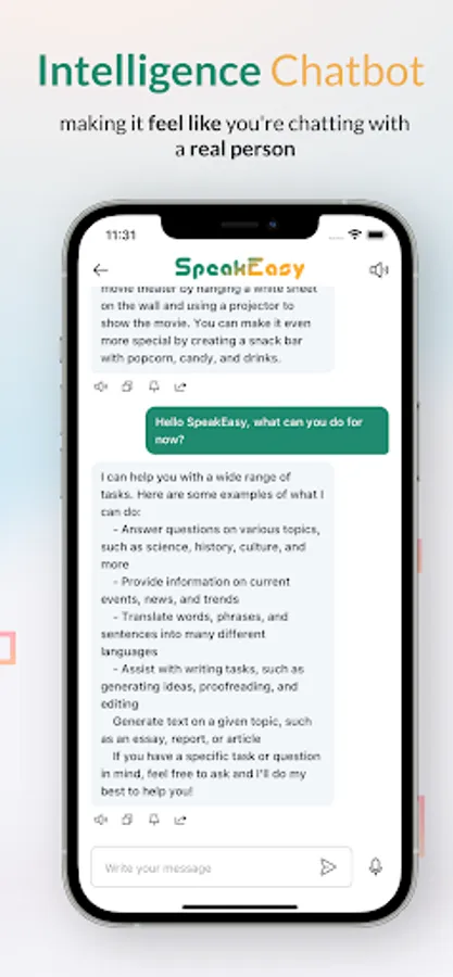 SpeakEasy - AI Chat, AI Friend is an AI chatbot and writing assistant powered by advanced ChatGPT technology. Our AI model uses the same AI technology, Chat GPT 3, which has been used by ChatGPT. If you have questions about anything in any area but have not found an answer or simply need a soul mate, our GPT chatbot is here to assist you. Plus, with a simple, user-friendly interface, it's easy to navigate and efficiently get the information you need. Another great feature of ChatGPT is its ability to learn and adapt. As you continue to use the app, ChatGPT will learn your preferences and provide personalized assistance. With its advanced machine learning capabilities, ChatGPT can understand your needs and provide tailored solutions. ChatGPT is an ultimate AI-powered chatbot that can assist you with your daily tasks and make your life easier.