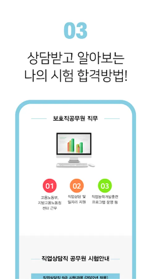 As a member of the Ministry of Employment and Labor, this job is in charge of administrative and consulting work for the success of prospective workers, such as job introduction, job search counseling, vocational aptitude test, and employment information collection.