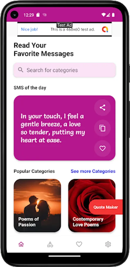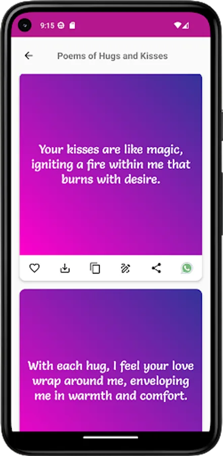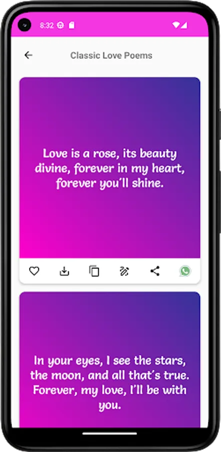 Seamless Social Media Integration: Share your poetry effortlessly across various social media platforms. With this app, you can easily send your heartfelt creations through WhatsApp, Facebook, Instagram, Twitter, or any other preferred app. Connect instantly with your loved ones, regardless of the distance, and let your love shine across the digital realm.
