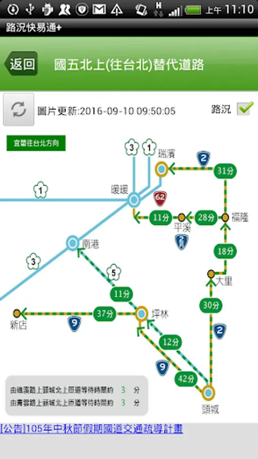 -以簡圖方式呈現易壅塞區域之主要路段與替代道路之旅行時間,方便用路人做改道決策,同時提供上交流道之排隊等候時間以避免因交管措施導致旅行時間無法反映真實狀況。
