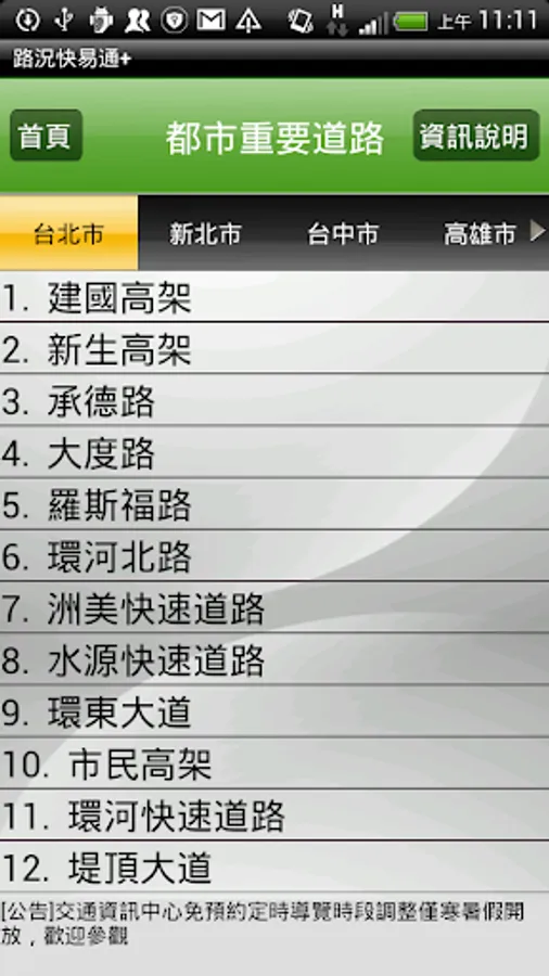 -目前提供台北市、新北市、台中市、高雄市及基隆市重要道路的即時交通資訊,包括時速、即時車流影像、事件等