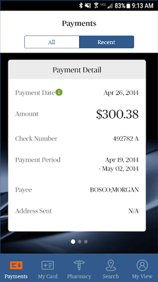 Ability to view Claim payment details such as payment date, amount, check number, payee and address information.