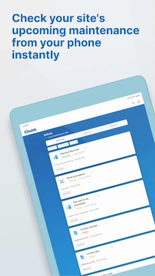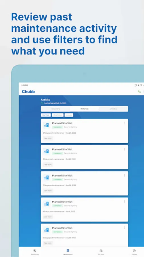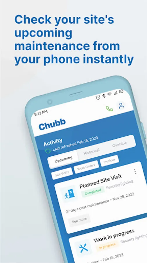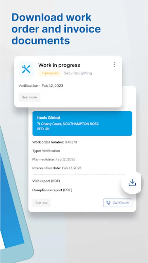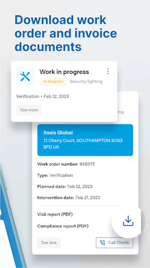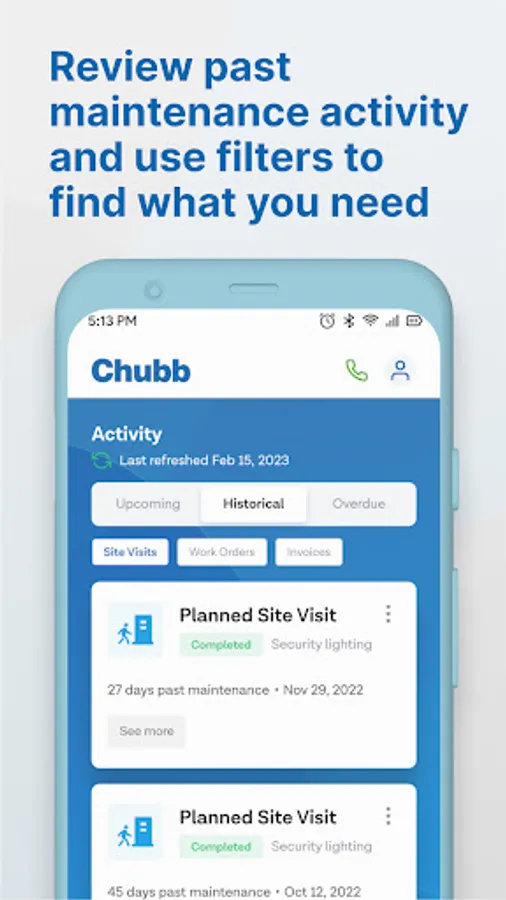 Customers can easily access their maintenance visit history for their fire and security systems and be informed of upcoming visits. With just a few clicks, customers can download or share their work orders, reports and invoices and also contact the appropriate Chubb department.