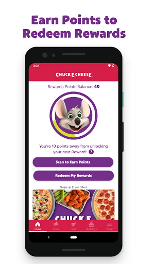 • Join Chuck E. Cheese Rewards to get special offers, unlock exciting prizes and more. You’ll earn Rewards Points for every dollar you spend, and even get special birthday treats for you and your family!